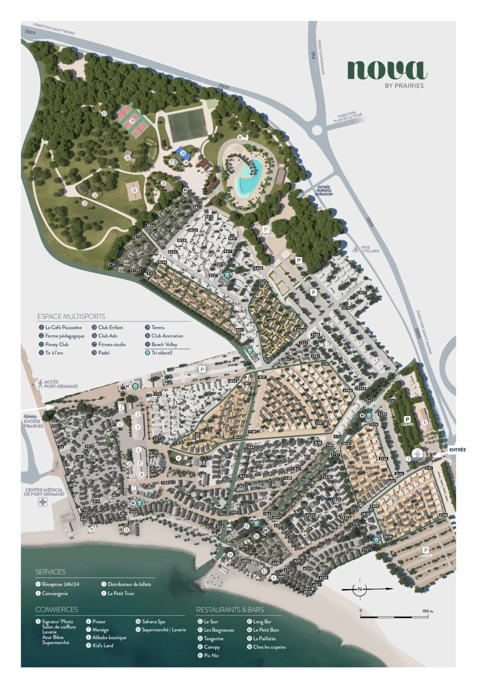 Die Nova Lodges liegen im Herzen des Ferienparks Prairies de la Mer. Auf dem untenstehenden Plan können Sie die verschiedenen Bereiche sehen, in denen die Nova Lodges angeboten werden.